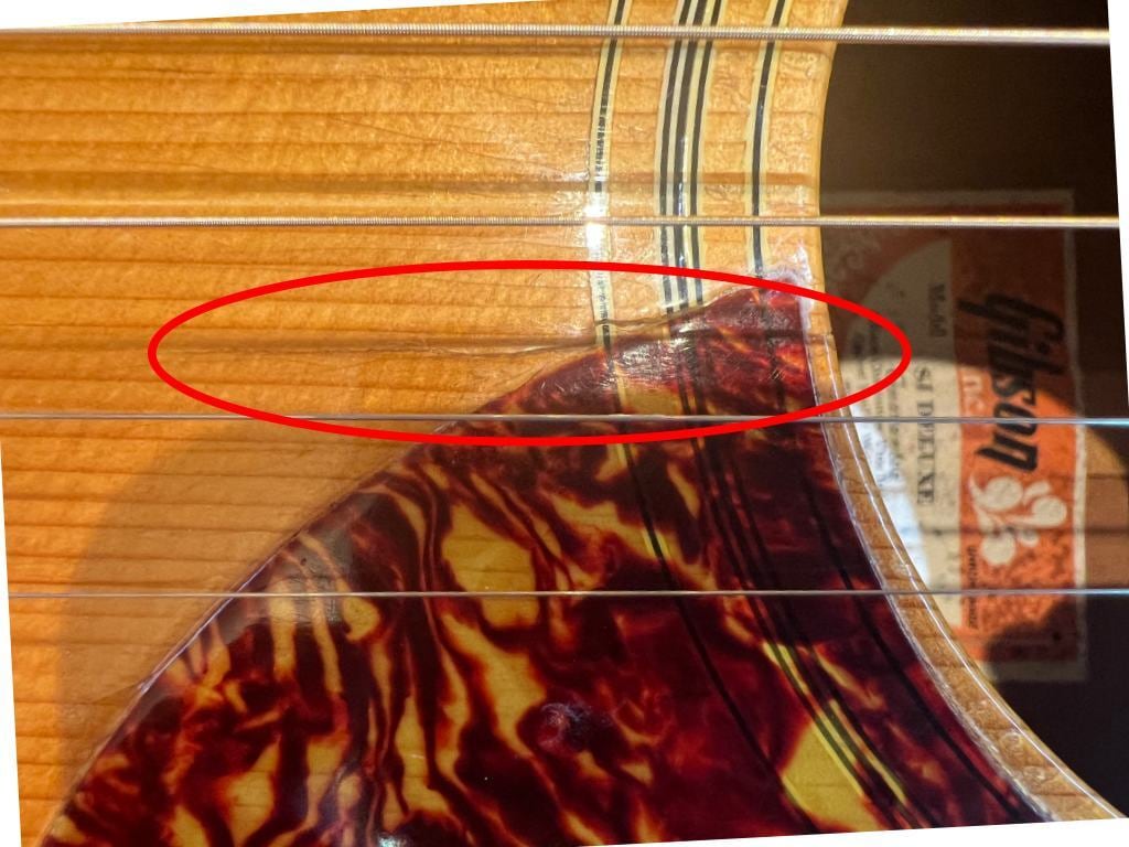 サウンドホールのネック側、ブリッジ側ともに割れた跡ありますが
